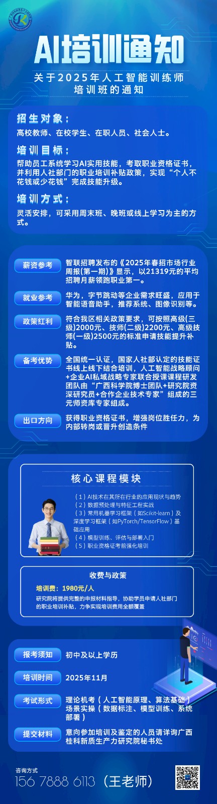 【通知】广西桂科新质生产力研究院关于举办2025年人工智能训练师培训班通知..