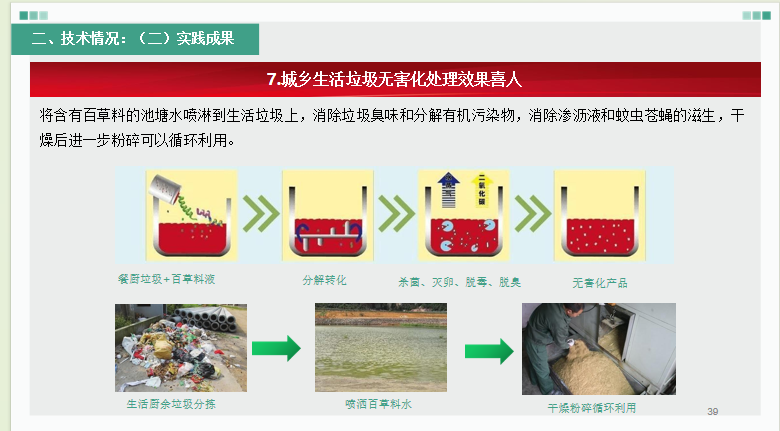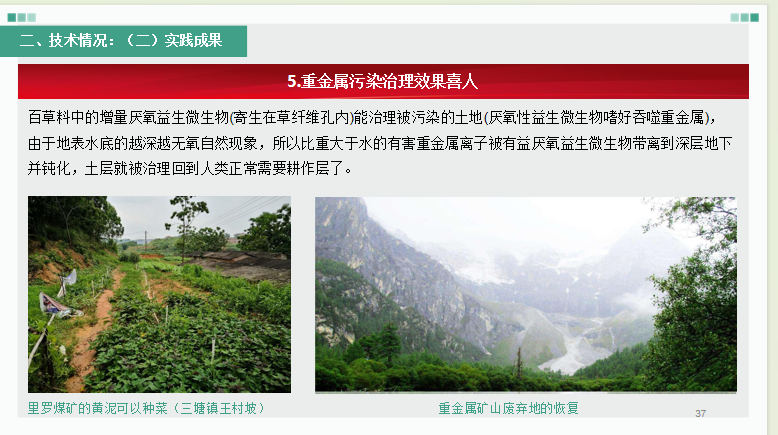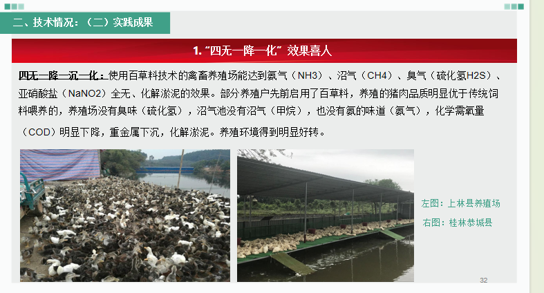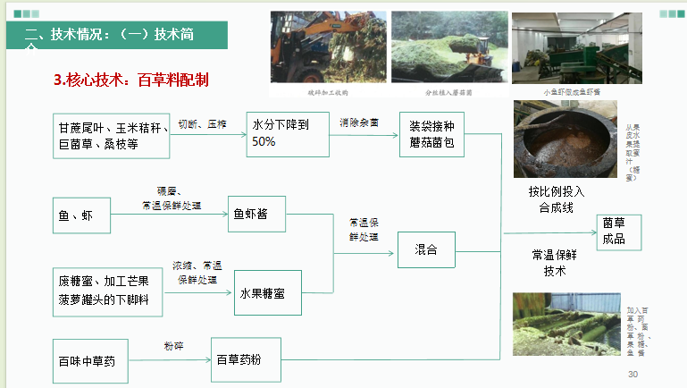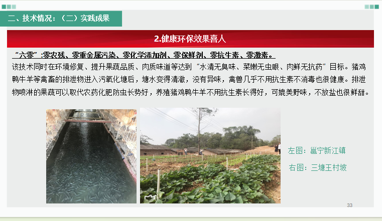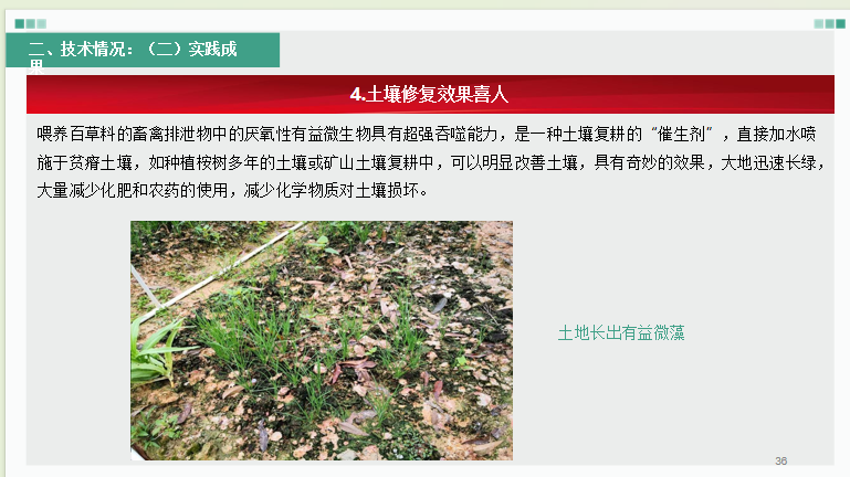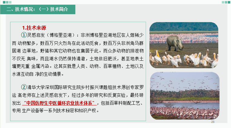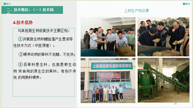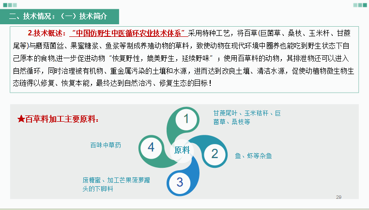 中医农业:⻝品安全的“新出路” 构建“返野⽣·循环利⽤”技术体系,通过中 草药饲料与种养结合的⽣态循环,从根本上保障 ⻝品安全、提⾼农⺠收⼊,助⼒乡村振兴。该项技 术是将百草料(巨菌草、桑枝、⽟⽶杆、磨菇菌丝、 果蜜糖浆等)制成动物饲料。⻝⽤百草饲料的禽 畜,⾁质鲜美且不含抗⽣素、激素;禽畜排泄物进 ⼊污氧化池塘后,继续⽣⻓硅藻螺旋藻蘑菇真 菌,塘⽔清澈⽆异味,可养殖经济⻥类;⻥塘⽔可浇灌果蔬,免去农药和化肥的使⽤。使 ⽤该项技术,还附带治理被有机物、重⾦属污染的⼟壤和⽔源的功能,实现改良⼟壤、 清洁⽔源、修复⽣态的⽬标!